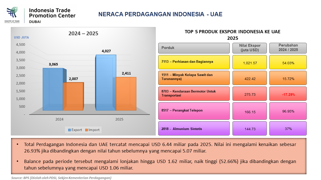 The Indonesia Trade Promotion Centre (ITPC) Dubai, established in 1985 under the Ministry of Trade of the Republic of Indonesia, promotes Indonesian trade in the UAE and beyond. We connect businesses, organize trade events, and provide market intelligence. Our services ensure smooth and secure trade operations, showcasing Indonesian excellence and fostering global trade relationships